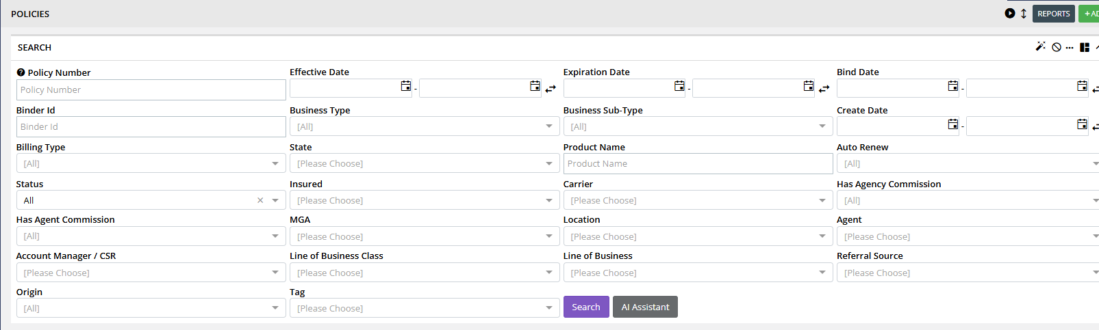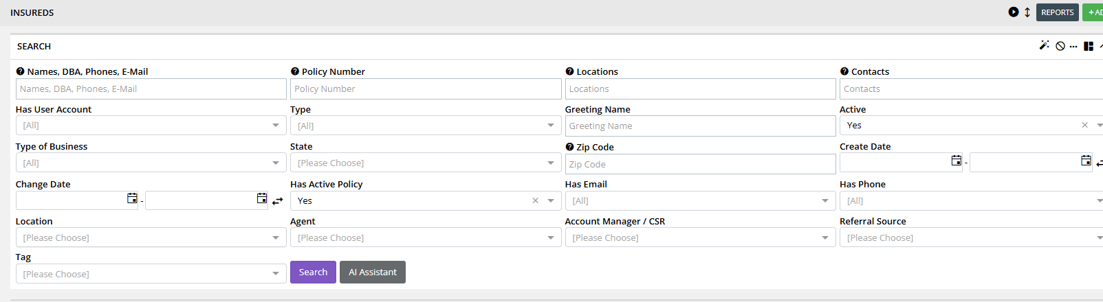 Exports from the Insureds and Policies list views include basic, high-level information, such as: